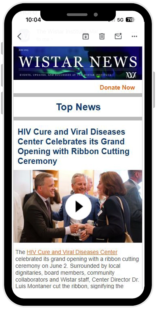 Wistar News brings together a community of biomedical researchers who are doing the hard work of solving big problems with science supporters who are championing innovative research worldwide. Wistar News is more than updates, as the newsletter celebrates the people, projects and success of Wistar Science and the growing life science sector in Philadelphia and beyond. Subscribers also enjoy special insights from our scientists and early release of Wistar’s soon-to-launch podcast.