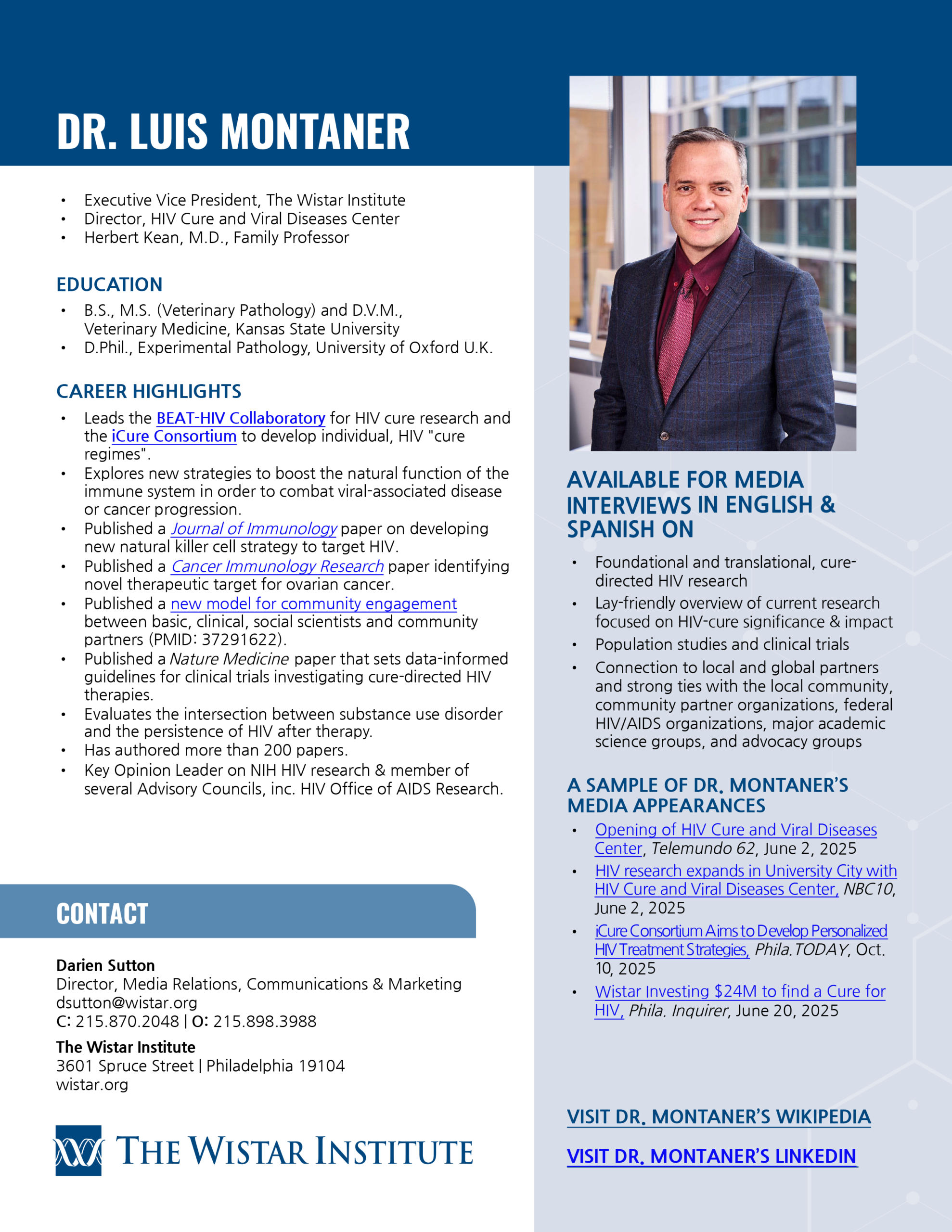 PRESS RELEASE CONTACT: Darien Sutton 215-898-3988 | dsutton@wistar.org PHILADELPHIA — (Nov. 11, 2025) — On Monday, Nov. 17th at 6:30 pm EST, Richard Jefferys, Basic Science, Vaccines and Cure Proje…