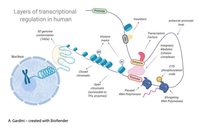 Transcriptional regulation is a multi-layer process carried out by specialized transcription factors, co-factors and enzymatic machineries working within the context of a structured chromatin landscape.