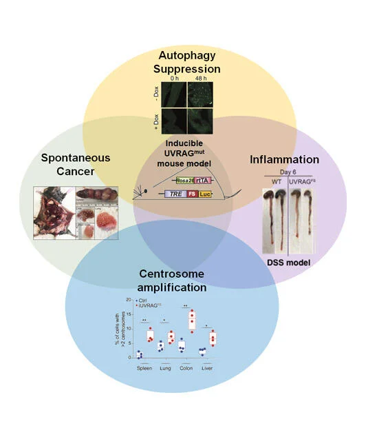 Macroautophagy/autophagy deregulation has been observed in perpetuated inflammation and the proliferation of tumor cells. However, the mechanisms underlying these changes have yet to be well-identified. UVRAG is one of the key players of autophagy, but its role in vivo remained puzzling. Our recent study, published in Nature Communications (Quach, Song et al), utilized a mouse model with inducible expression of a cancer-derived frameshift (FS) mutation in UVRAG that dominant-negatively inhibits wild-type UVRAG, resulting in impaired stimulus-induced autophagy. The systemically compromised autophagy, particularly mitophagy, notably increases inflammation and associated pathologies. Another pivotal result of this study is that it uncovered a “missing molecular link” between age-related decreases in autophagy and aging-induced spontaneous cancers, which could provide new insight into how basal autophagy protects against cancer. Using our mouse model, we observed that suppression of UVRAG accelerated age-related decline in autophagy and impaired autophagic turnover of oncogenic β-catenin, leading to increased proliferation and tumor formation in mice. It remains to be seen whether this age-dependent regulation of β-catenin by autophagy will translate to other autophagy-related cancer models. Nevertheless, our work represents a key advance in understanding how UVRAG and by extension autophagy works in vivo.